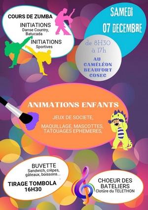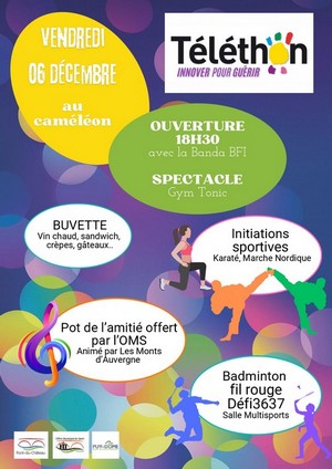 Il y aura également une vente d'objets au profit de l'AFM Téléthon, des billets de la tombola et enfin des urnes pour recevoir vos dons dont l'intégralité sera reversée à l'AFM Téléthon dans les différents lieu de l'événement (caméléon, espace beaufort et COSEC) et dans l'Intermarché de Pont-du-Château.